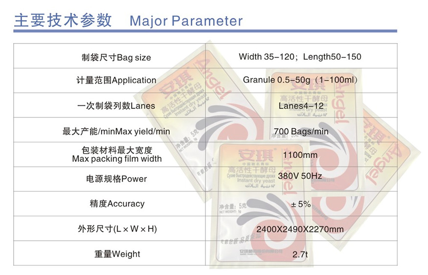 Correcting double-side symbols, automatic tracking adjustment. A series packing program completed automatically that is making bags, measure, filling, sealing, cutting, easy tear notches, line-crow easy tear line, typing code, accountings and so on. One filling and automatically packing multilane bags is completed in the same time.